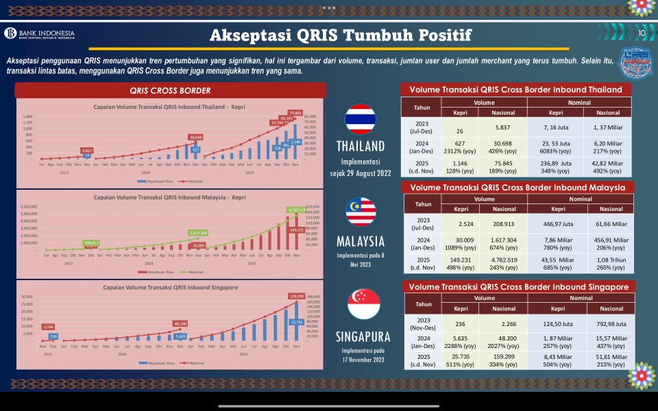 Lonjakan terjadi baik dari sisi jumlah transaksi, nominal transaksi, hingga adopsi pelaku usaha. Kepri menjadi salah satu daerah dengan kenaikan transaksi inbound tertinggi, terutama dari wisatawan asal Thailand, Malaysia, dan Singapura.