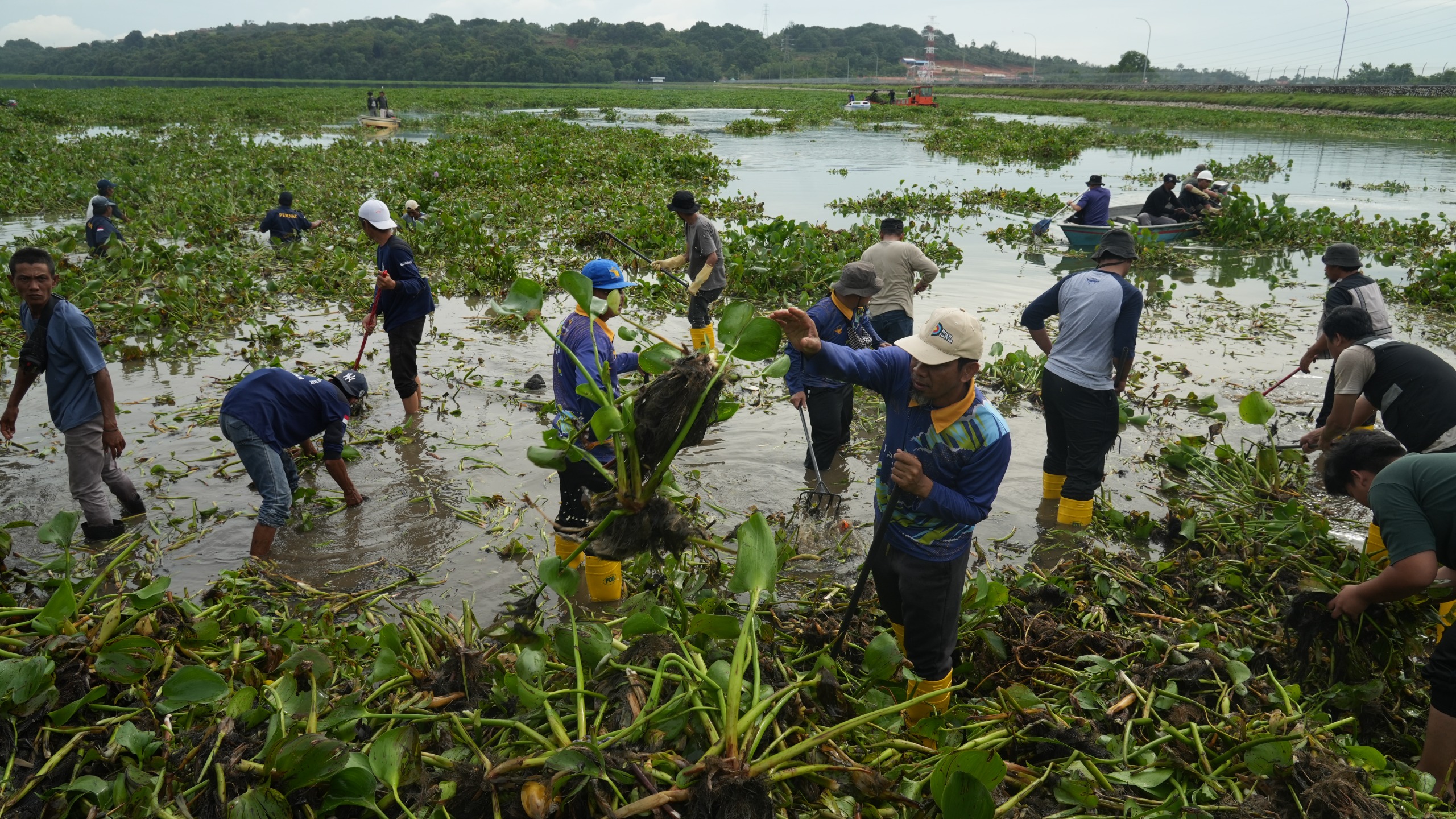 Sebanyak ratusan voluntir dari pecinta lingkungan, Komunitas Batam Hikers, Persatuan Masyarakat Nelayan Air Tawar Duriangkang dan karyawan Agung Toyota membersihkan eceng gondok yang memenuhi waduk.